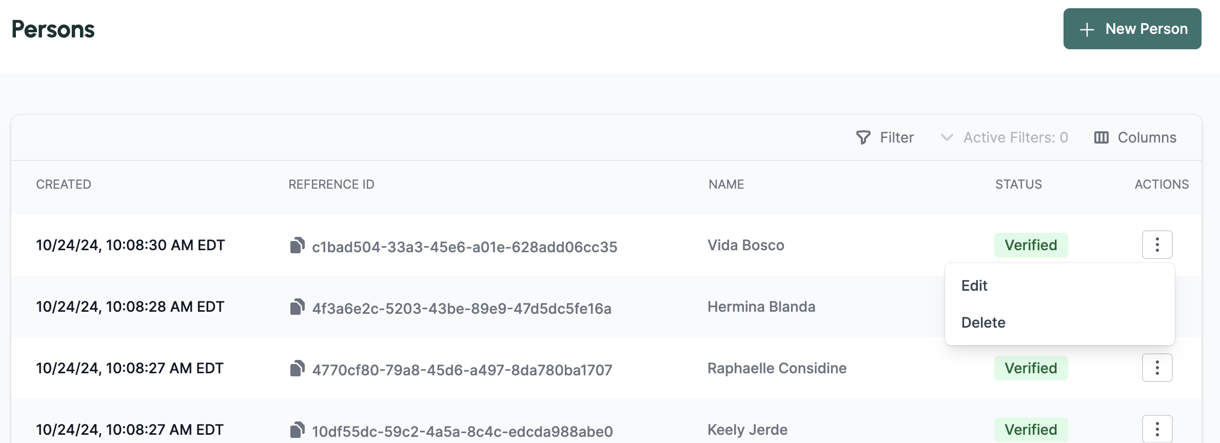 You can now delete persons, businesses and external accounts through the portal or via an API request.To delete in the portal, simply navigate to theActions menu of the persons, businesses, or accounts table, and select Delete for the entity that you’d like to delete.