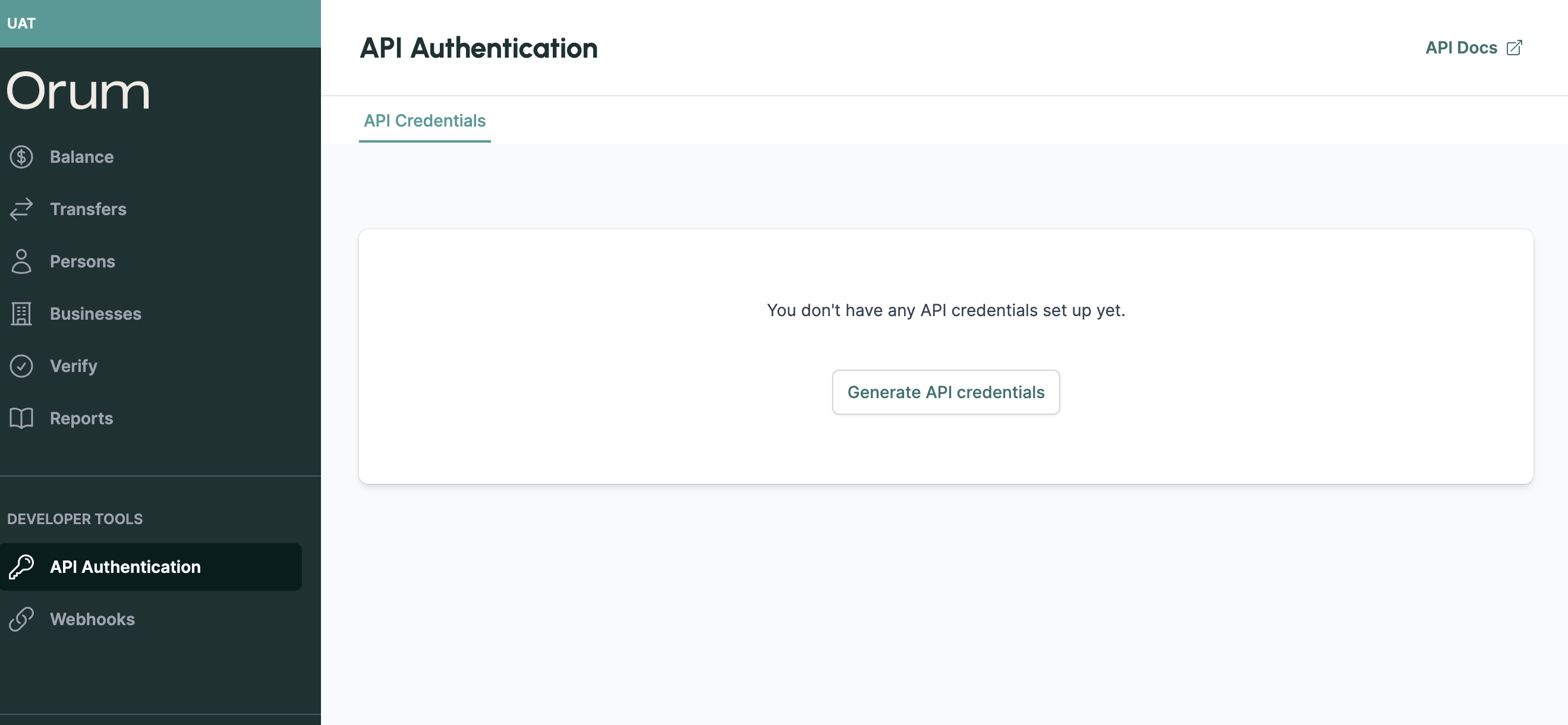 API Credentials are specified within the body of the Orum Auth API call. These credentials can be created and deleted within the “API Authentication” page. See the screenshots below for the full flow: