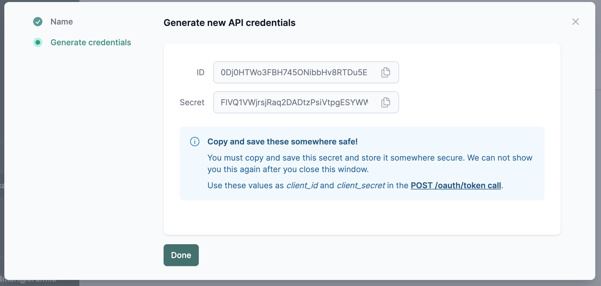 client_secretstore it in a secure location as you will not be able to retrieve it again. If you lose the original one or want torotateyour api credentials, you must generate a new set of credentials and delete the original one. Only delete the original one after you have changed all authentication to use the new secret as deleting a client will result in immediate failure of authentication requests with those credentials.